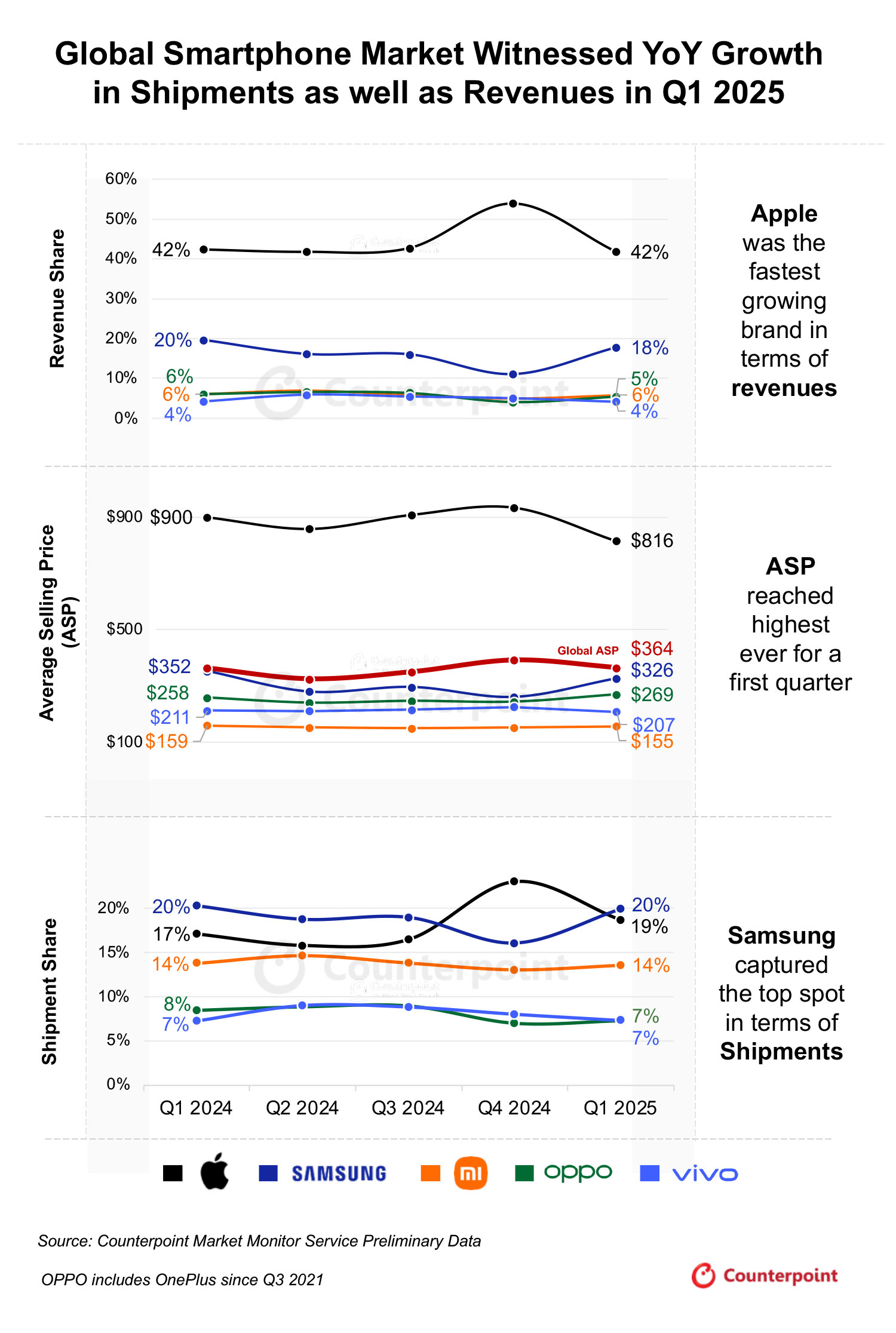 IT之家 5 月 6 日音书,阛阓拜谒机构 CounterPoint Research 于 5 月 2 日发布博文,论说称 2025 年第 1 季度大家智高手机阛阓出货额和出货量均同比增长 3%。